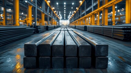 Metal billets stacked up inside of metallurgy factory storage