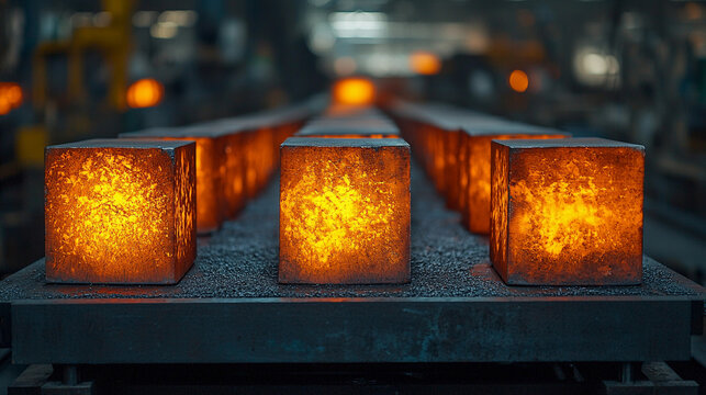 Hot steel billets on a conveyor belt in a factory.  Rows of glowing, rectangular metal pieces
