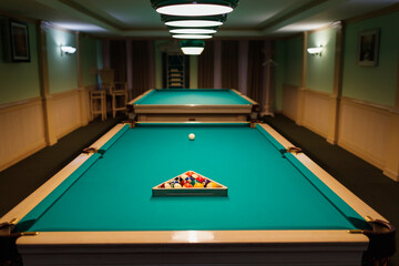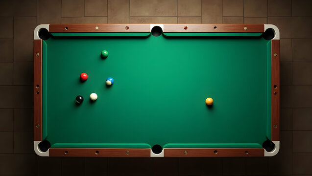 Overhead view of a vibrant green pool table showcasing a game in progress with scattered balls, capturing the essence of leisure and competitive sport