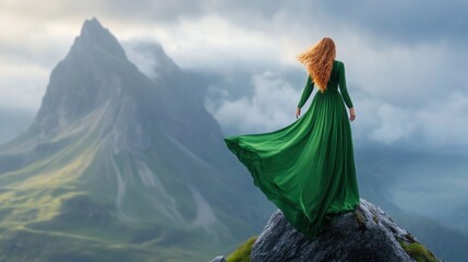A woman gazes out over a dramatic mountain vista, her long green dress billowing in the breeze. The sky is filled with moody clouds, enhancing the enchanting atmosphere of the scene