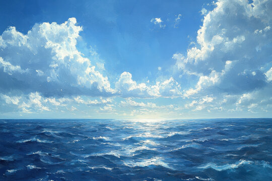 A panoramic view of a vast blue sky with billowing clouds ideal for copy space image