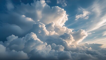 Dramatic cloud formation with billowing clouds and blue sky illuminated by sunlight ideal for atmospheric backgrounds and textures Copy Space