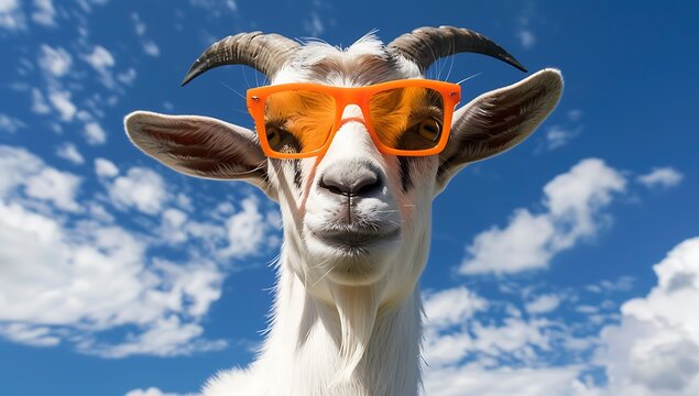 A picture of a goat wearing orange sunglasses