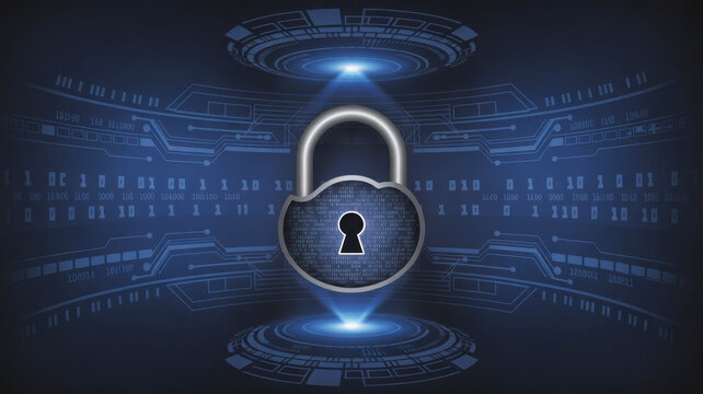 Digital lock icon is showcased centered in the image, displaying intricate electronic circuitry on its surface with a glowing keyhole, set against a backdrop of flowing binary code.