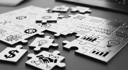 Strategic Business Solution: Metallic Puzzle Pieces with Innovation, Growth, and Partnership Icons