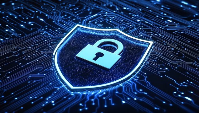 Digital security shield icon with a padlock overlaying a glowing blue circuit board background representing data protection