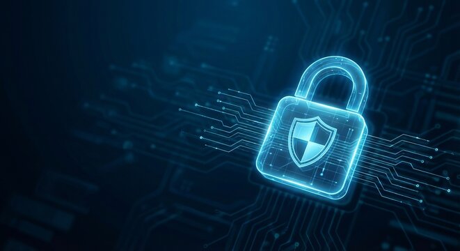 Glowing digital padlock icon with shield overlaying a dark blue circuit board background representing data security