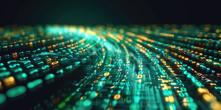 Dynamic Abstract Digital Data Stream: Vertical Columns of Glowing Golden and Cyan Particles Flowing Over a Reflective Surface of Numeric Characters Concept for AI, Big Data, Technology, Connectivity