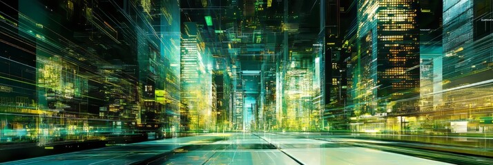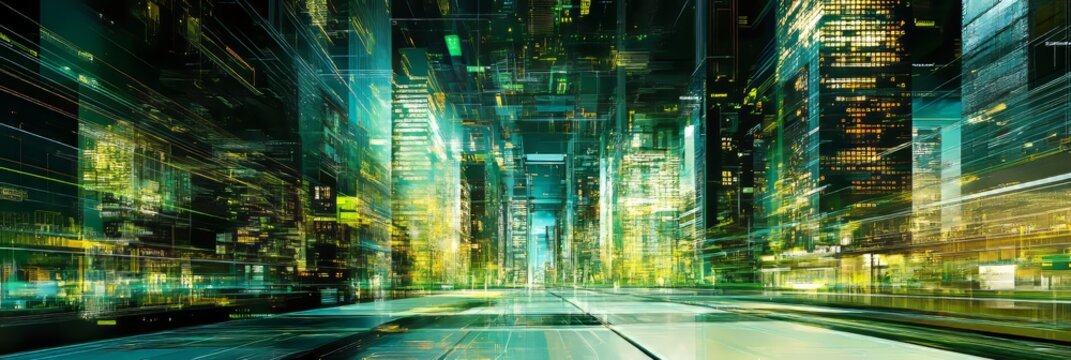 Abstract Cityscape With Glowing Lines, Representing Digital Technology And Data Flow.