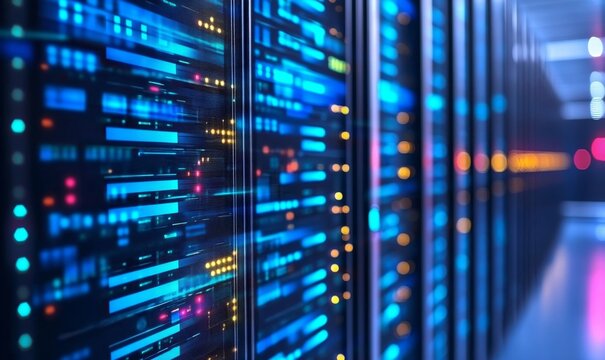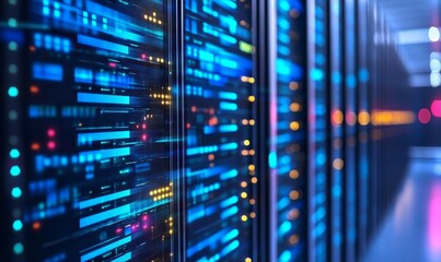Binary code flowing over server infrastructure