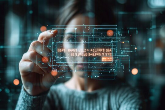 Businesswoman analyzes financial data with digital interface