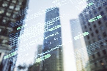 Double exposure of abstract programming language interface on modern skyscrapers background, research and development concept