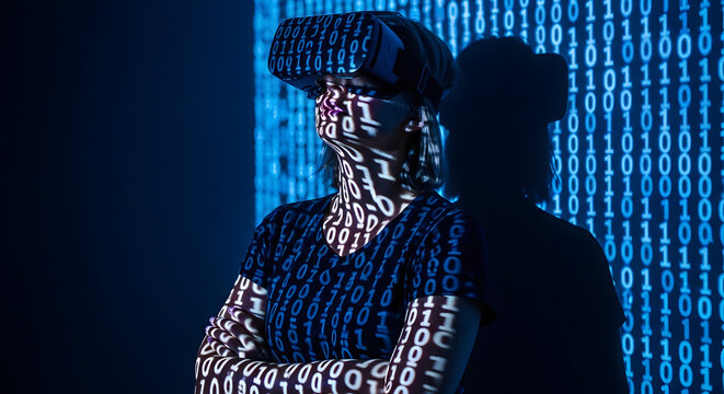 Virtual Reality Immersion: A woman engrossed in a virtual reality experience, facing a wall of flowing binary code, symbolizing the intersection of technology and human exploration.