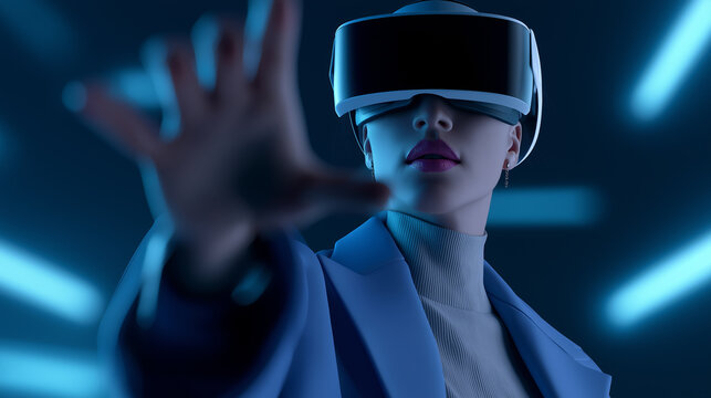 Woman wearing a futuristic VR headset with hand extended in a digital environment of glowing blue code.