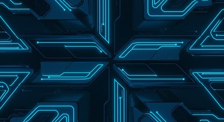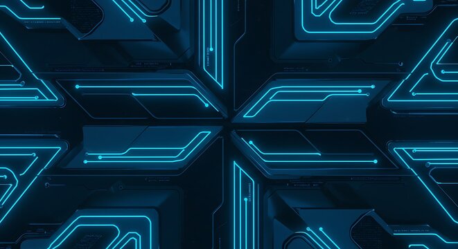 Futuristic abstract technology background featuring symmetrical glowing blue digital circuit pathways creating a high-tech visual