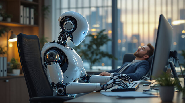 A humanoid robot types on a keyboard in a dark office at night while a tired entrepreneur sleeps nearby, illustrating automation, AI and the future of work