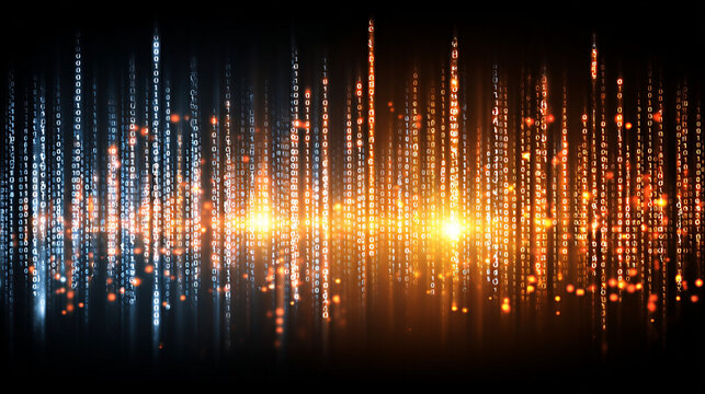 Glowing blue binary code cascading on dark background—symbolizing digital data flow.