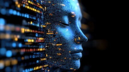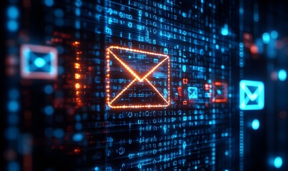 glowing email icons and a stream of binary code representing data transfer, internet and communication concepts. The binary code flows around the icons, implying digital and network connections.