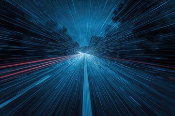 Rapid digital data transmission along a blurred pathway symbolizing swift information exchange. Theme revolves around advanced digital evolution, groundbreaking innovation, and flexible business