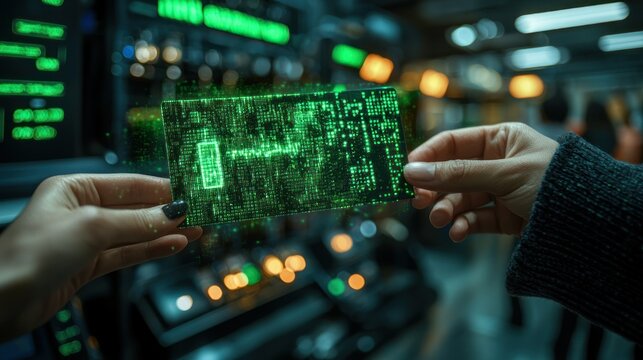 Digital hologram glowing with binary code while hand interacts with it, creating futuristic vibe