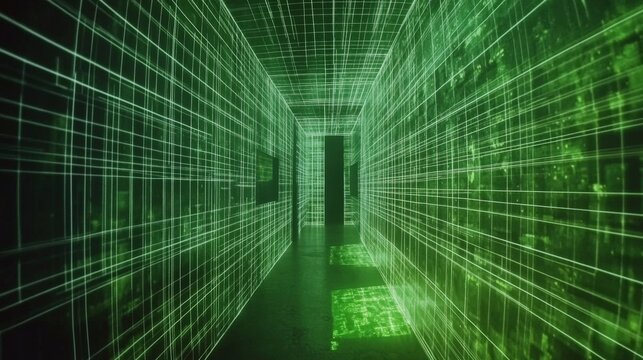 Futuristic Digital Corridor with Glowing Green Grid Lines