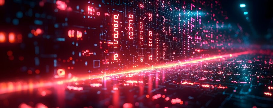 Futuristic digital landscape with glowing neon binary code and circuits representing data flow and technology