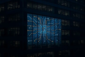Modern office building illuminated with a futuristic circuit board design representing digital transformation and technological advancement