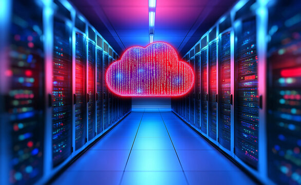 A glowing digital cloud symbol overlaid on a data center with streams of binary code representing cloud computing.