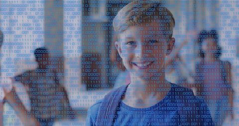 School student wearing backpack in corridor with binary code overlay, symbolizing edtech