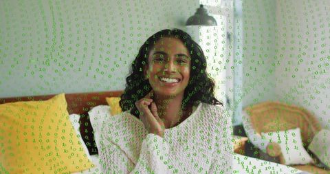 Young woman facing coastline windblown hair green binary code overlay digital identity
