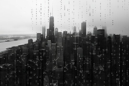 Binary Code Overlays Modern Cityscape Images