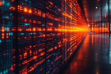 Glowing data streams on server wall.