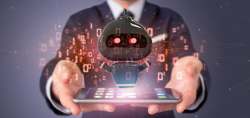 Businessman holding Chatbot with binary code, message and data 3d rendering