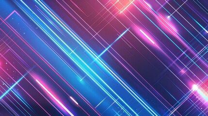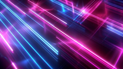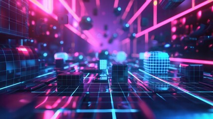 Futuristic 3D background with glowing neon grids and floating geometric shapes.
