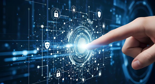 A human finger interacts with a glowing digital network interface, symbolizing data flow and cybersecurity.