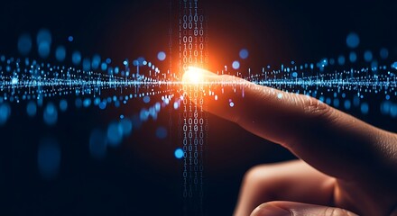Finger touching a glowing stream of binary code and light particles on a dark background, representing digital technology and data flow