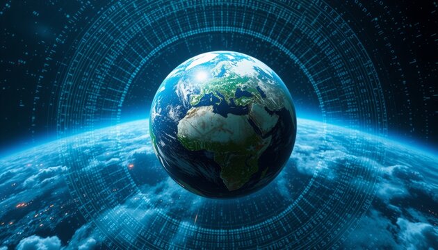 digital earth globe surrounded by glowing data streams, symbolizing global connectivity and the speed of digital transformation in business Generative AI