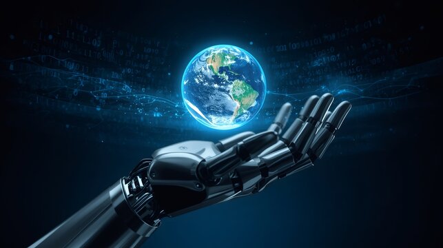 Robotic arm holding planet earth with digital data stream flowing