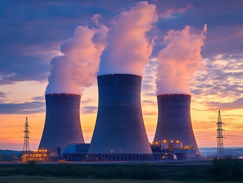 Nuclear power station with cooling towers releasing steam, energy production, nuclear infrastructure, low-carbon electricity generation