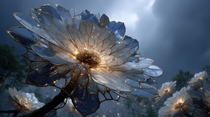 a flower with petals shaped like solar panels, glowing under binary sunlight
