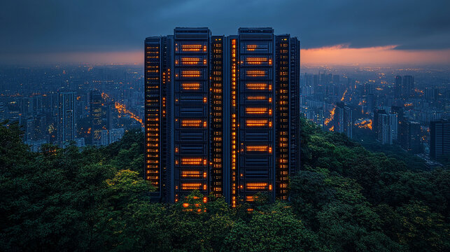 Digital data storage concept with glowing server and binary code minimalistic design bright tone modern technology with blurred background and empty caption space