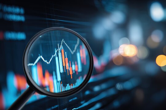 A magnifying glass over an electronic chart, highlighting the upward trend of stock charts on digital screens