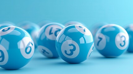 Close up of blue lottery balls on pastel background with focus on lucky number 3