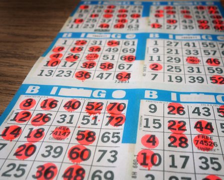 Many colorful bingo boards or playing cards for winning chips. Classic US or canadian five to five bingo cards on bright background