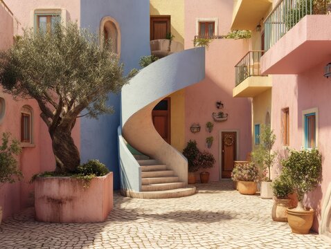 Pastel Colored Mediterranean Courtyard with Spiral Staircase and Olive Trees