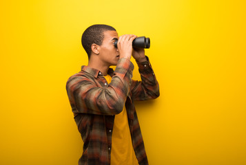 Young african american man on vibrant yellow background and looking for something in the distance with binoculars