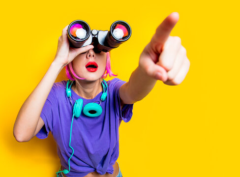 Young style girl in purple clothes with binoculars