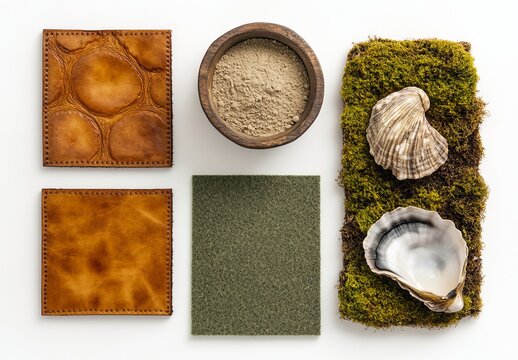 Vegan leather shoes from mushroom mycelium. samples of vegan bio leather, eco friendly concept, bio based sustainable alternative to leather made of mushroom spores and plant fibres. Generative AI.