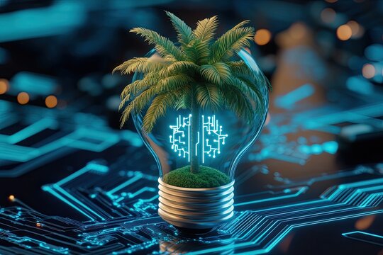 Digital Glowing Plant Sprout on Cyber Human Hand