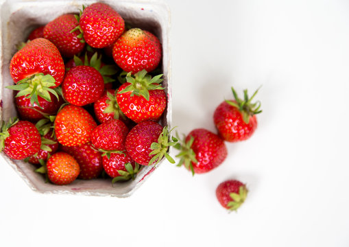 Frische Erdbeeren in der Pappverpackung von oben fotografiert flatlay vor weißem Hintergrund